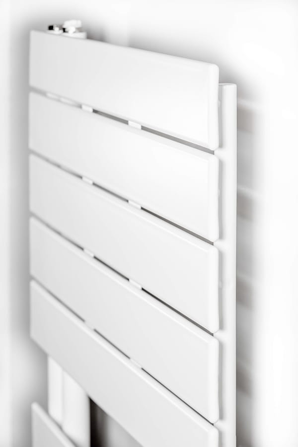 Panele grzewcze o szerokim i płaskim kształcie ułożone są rytmicznie w grupy i zamontowane na podwójnym kolektorze.