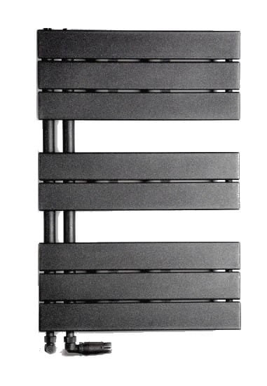 Panele grzewcze o szerokim i płaskim kształcie ułożone są rytmicznie w grupy i zamontowane na podwójnym kolektorze.