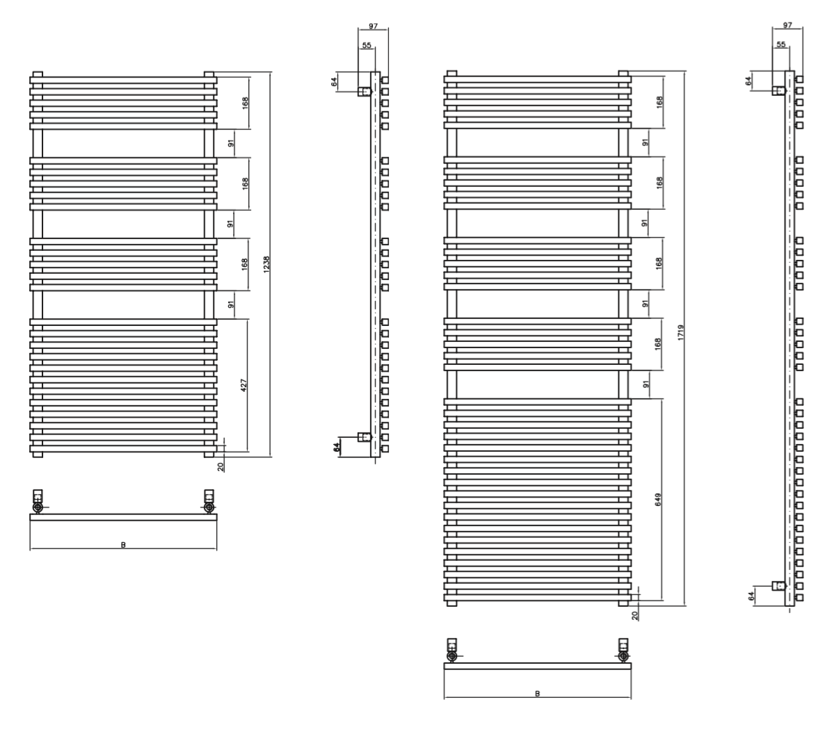 Kwadratowe poziome rury 20 x 20 mm rozmieszczone są w sekwencji, która umożliwia swobodne wieszani ręczników.