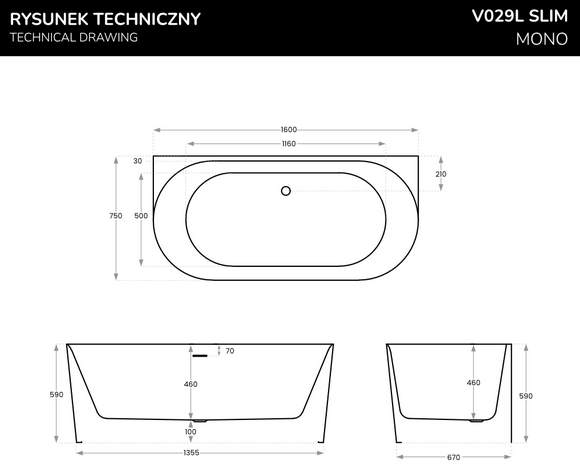Wanna narożna Corsan MONO SLIM w rozmiarach: 160x75 cm, 170x75cm